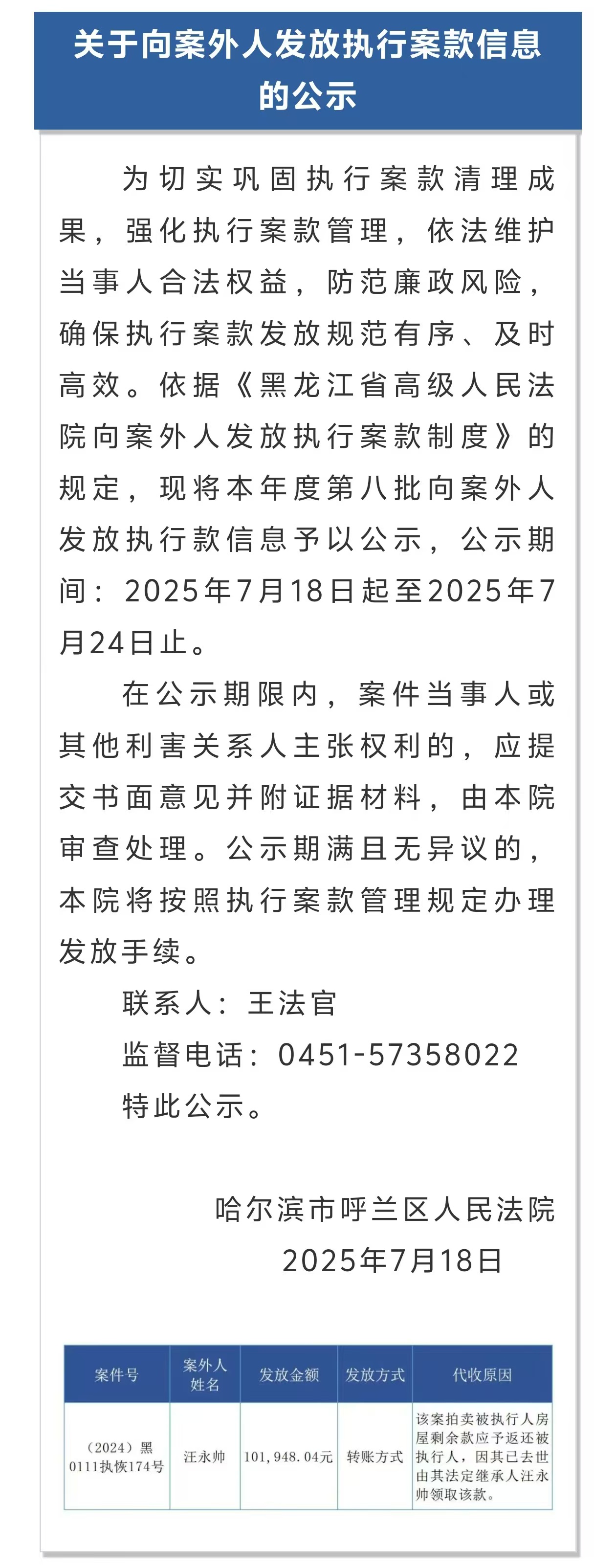 呼兰区人民法院关于向案外人发放执行案款信息的公示